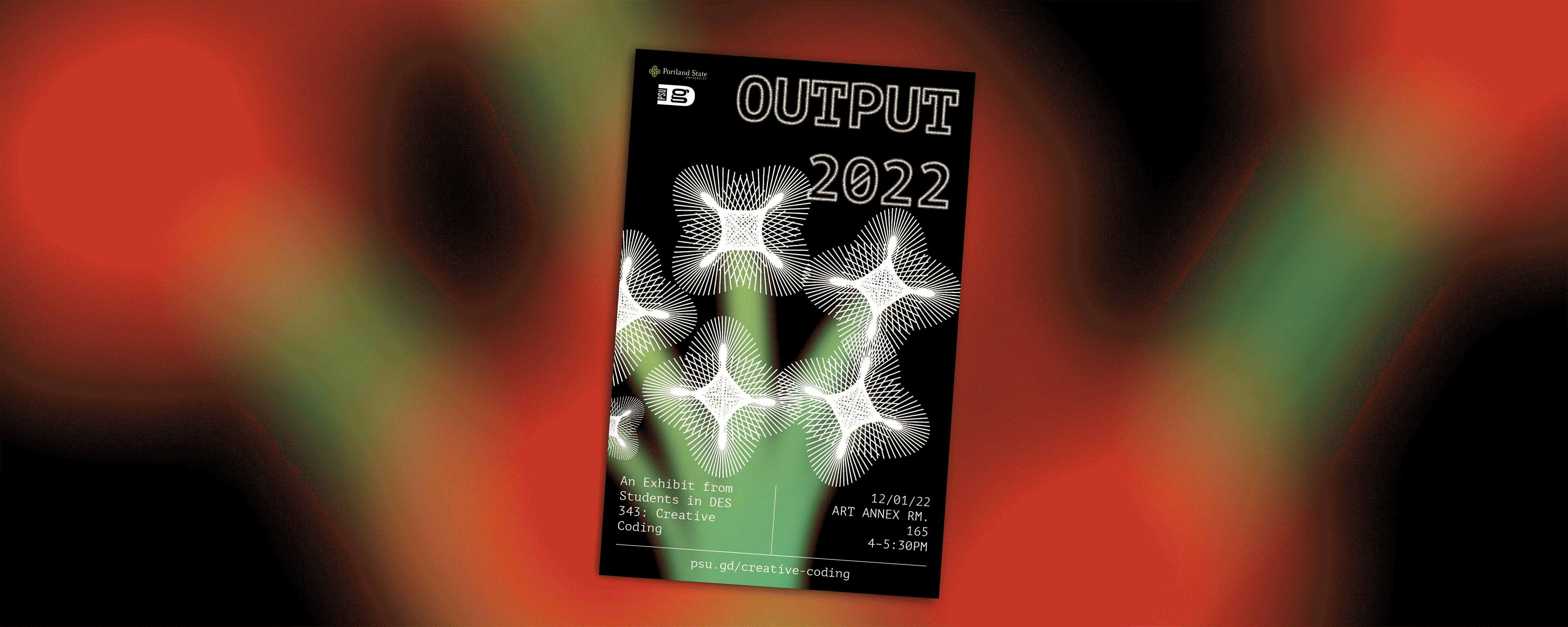 Output 2022 was an in-person showcase event hosted at the School of Art and Design at Portland State University in the winter of 2022. This poster series (along with others made by people in the showcase) was based on implementing creative coding in a projection mapping setting. I, and other fellow students, displayed our own posters that we made to advertise the event beforehand.